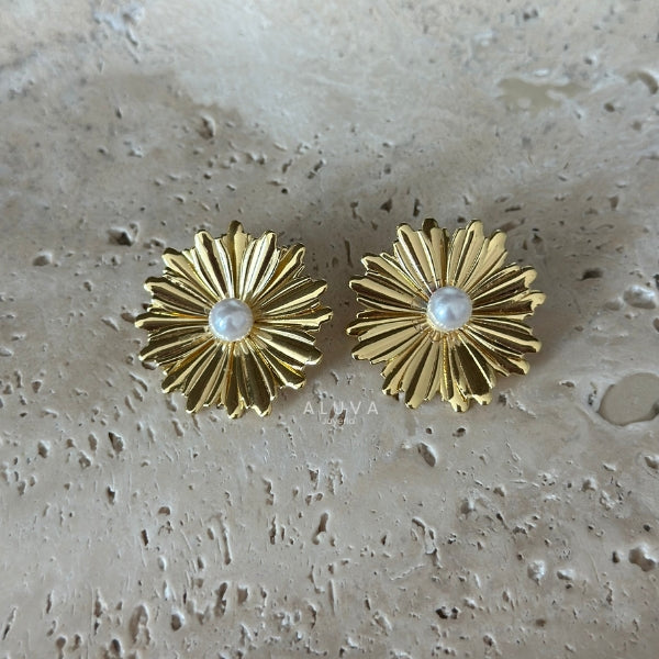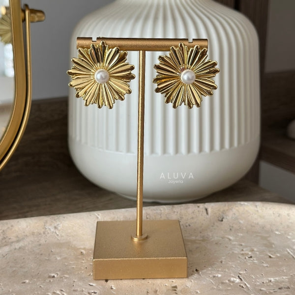 Arete flor con perla en tamaño mediano, material chapa de oro
