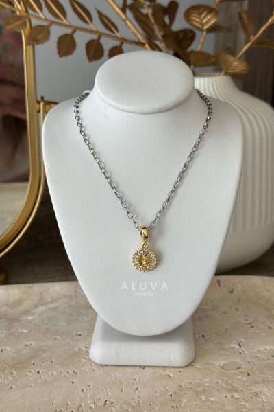 Cadena Virgen de Guadalupe de baguette en material chapa de oro