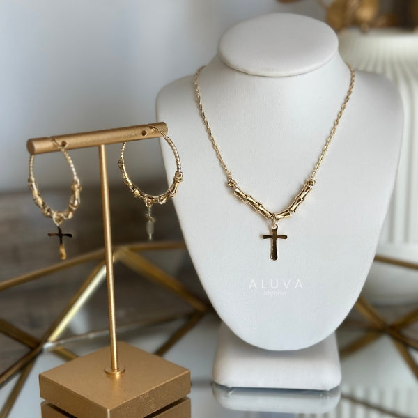 Set de collar con arracadas con dije de cruz en material chapa de oro