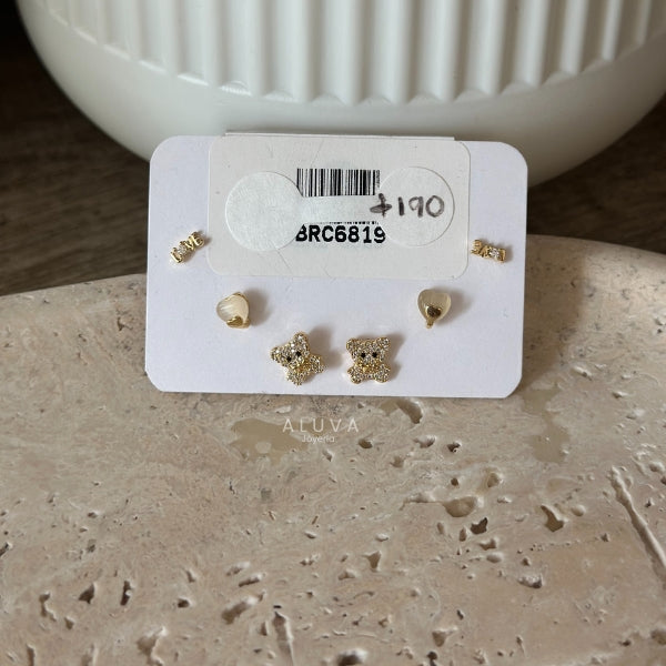 Set de 3 aretes en forma de oso de tamaño pequeño en material chapa de oro