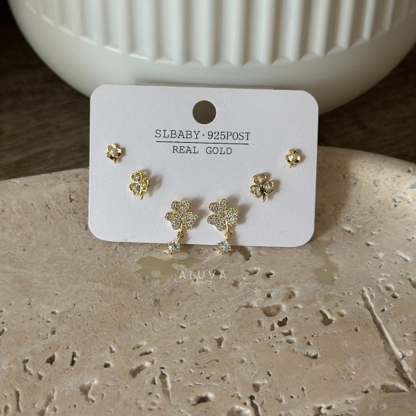 Set de 3 aretes en forma de trebol de tamaño pequeño en material chapa de oro